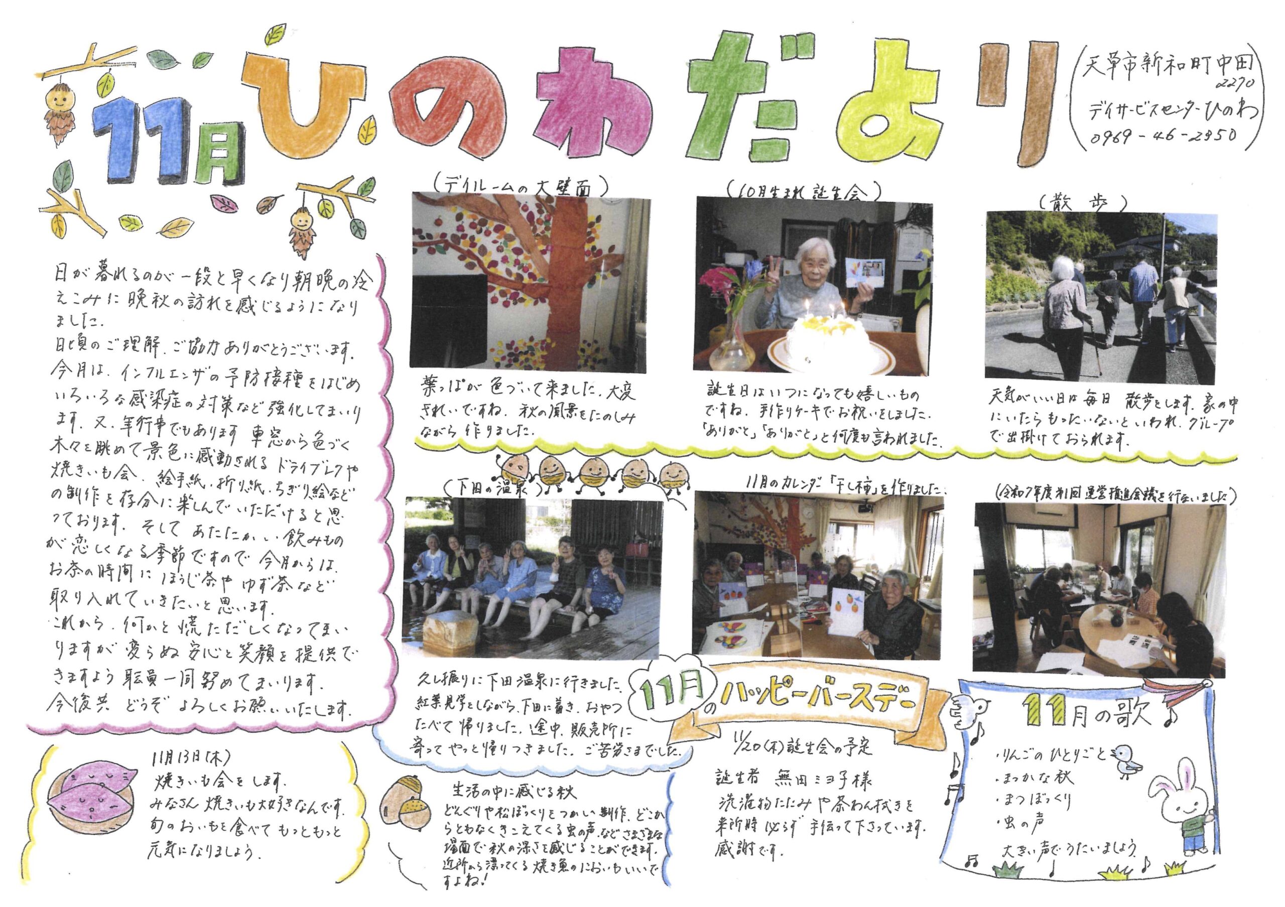 2025年11月のデイサービスセンターひのわのお便りを掲載いたしました。